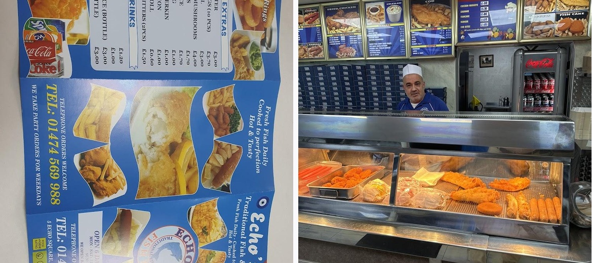 Welcome to Echo's Fish & Chips, your go-to spot in Gravesend for the finest fish and chips! Located at 5 Echo Square, our casual eatery serves up freshly cooked, crispy delights, from succulent cod to golden battered sausages, all at an affordable price range of £1–10. Perfect for a quick bite or a leisurely lunch, we offer convenient takeout options and a welcoming atmosphere with wheelchair accessibility. Enjoy our kids' menu and exceptional customer service that has locals raving. Whether dining in or taking away, Echo's guarantees quality and satisfaction in every wholesome meal. Come and experience the best fish bar in town!Diners rave about the quality of food, particularly the crispy chips and golden battered cod. Reviews frequently mention the portions as generous, making it great value for money. The friendly service is another highlight, contributing to a welcoming atmosphere. Many regulars also appreciate the cleanliness of the restaurant and the efficiency of service, especially during the lunch rush. Kids appreciate the colorful menu items designed just for them, making it a family-friendly spot. For a unique twist, many enjoy pairing their meal with curry sauce, which has gathered a small fan club of its own.
